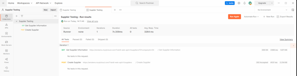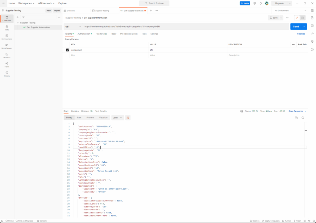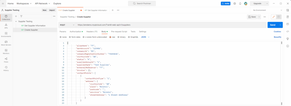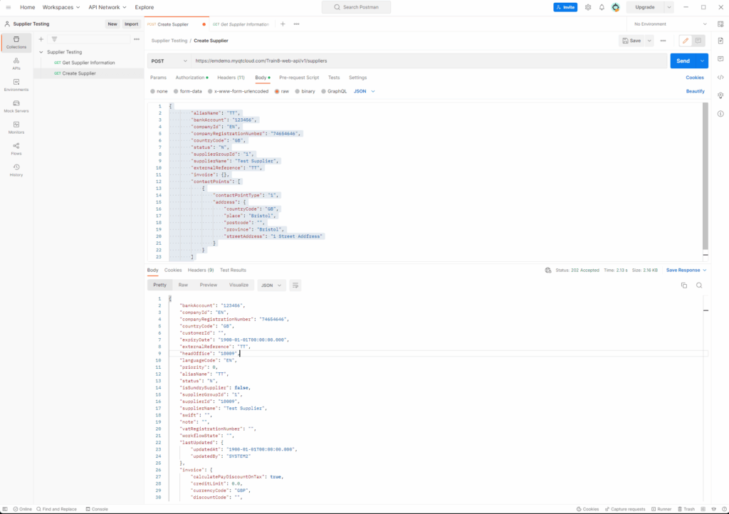 Once you’ve set up your API request, you can send the request by clicking on the Send button in the top-right corner of the screen. This will execute the API request and display the response in the Response section of the screen. Below is a successful test result with a 202 Status Accepted, it has created a new Supplier record in Unit4 ERP.