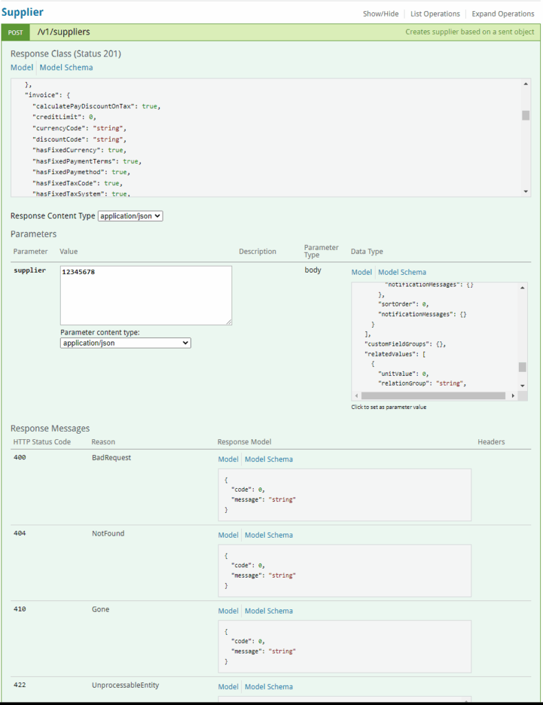 Swagger UI is also a powerful tool that can be used to troubleshoot REST API issues. It provides a web interface that allows developers to interact with REST APIs and explore their endpoints, parameters, and responses. Below are the two examples of the two calls we did above, to read the supplier and to create a supplier, both are on V1 of Swagger.