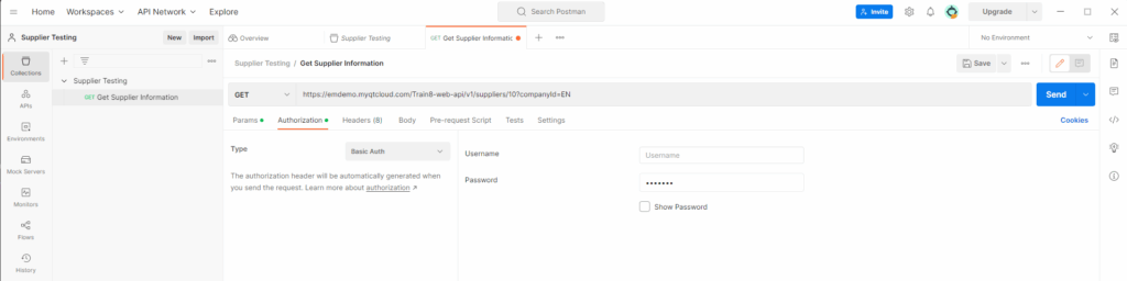 Once the collection is created, we can start creating requests. To create a new request, click on the Add a Request text in the top-left corner of the screen. Give your request a name and select the HTTP method you want to use (GET, POST, PUT, DELETE, etc.). In the first example we are going to be using GET and we are going to get a supplier. In the request tab, enter the URL for the Unit4 ERP API endpoint you want to test, you can also add any required headers or parameters. In the authorisation section select the type required by your system, in this example it will be Basic Auth and a Username and Password will be input in here.