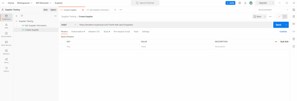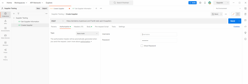 Next, we are going to be creating a new collection for our Supplier Creation API request. To do this, right click on your Collection and select add request. Give your request a name and select the HTTP method you want to use (GET, POST, PUT, DELETE, etc.). In this example we are going to be using POST and we are going to create a supplier. In the request tab, enter the URL for the Unit4 ERP API endpoint you want to test, you can also add any required headers or parameters, for our example we need to add Content-Type with a value of application/json. In the authorisation section select the type required by your system, in this example it will be Basic Auth and a Username and Password will be input in here.